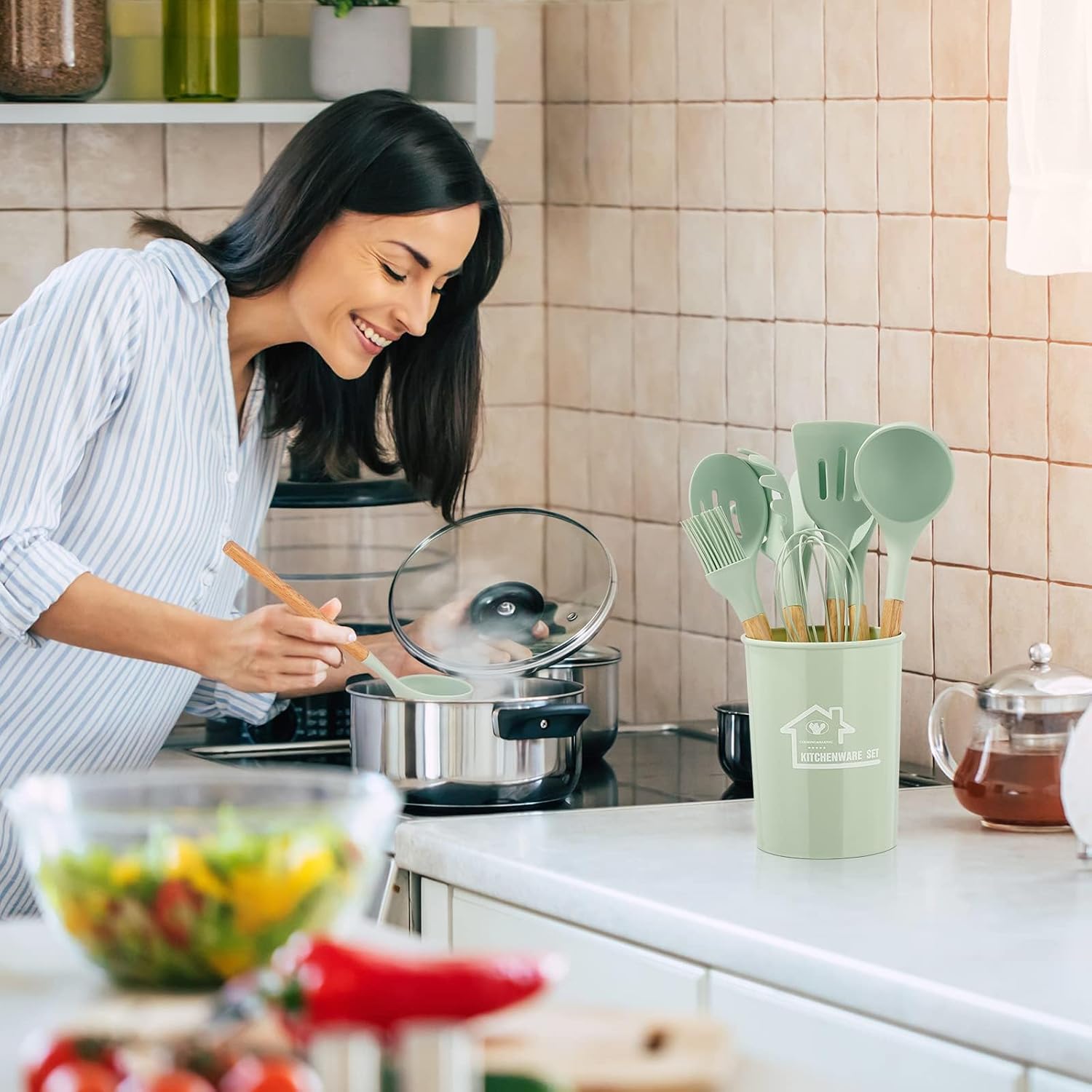 BIGTHREE 12 Pcs Silicone Cooking Utensils with Holder, Kitchen Utensil Set, Non-Stick Cooking Tools with Wooden Handle