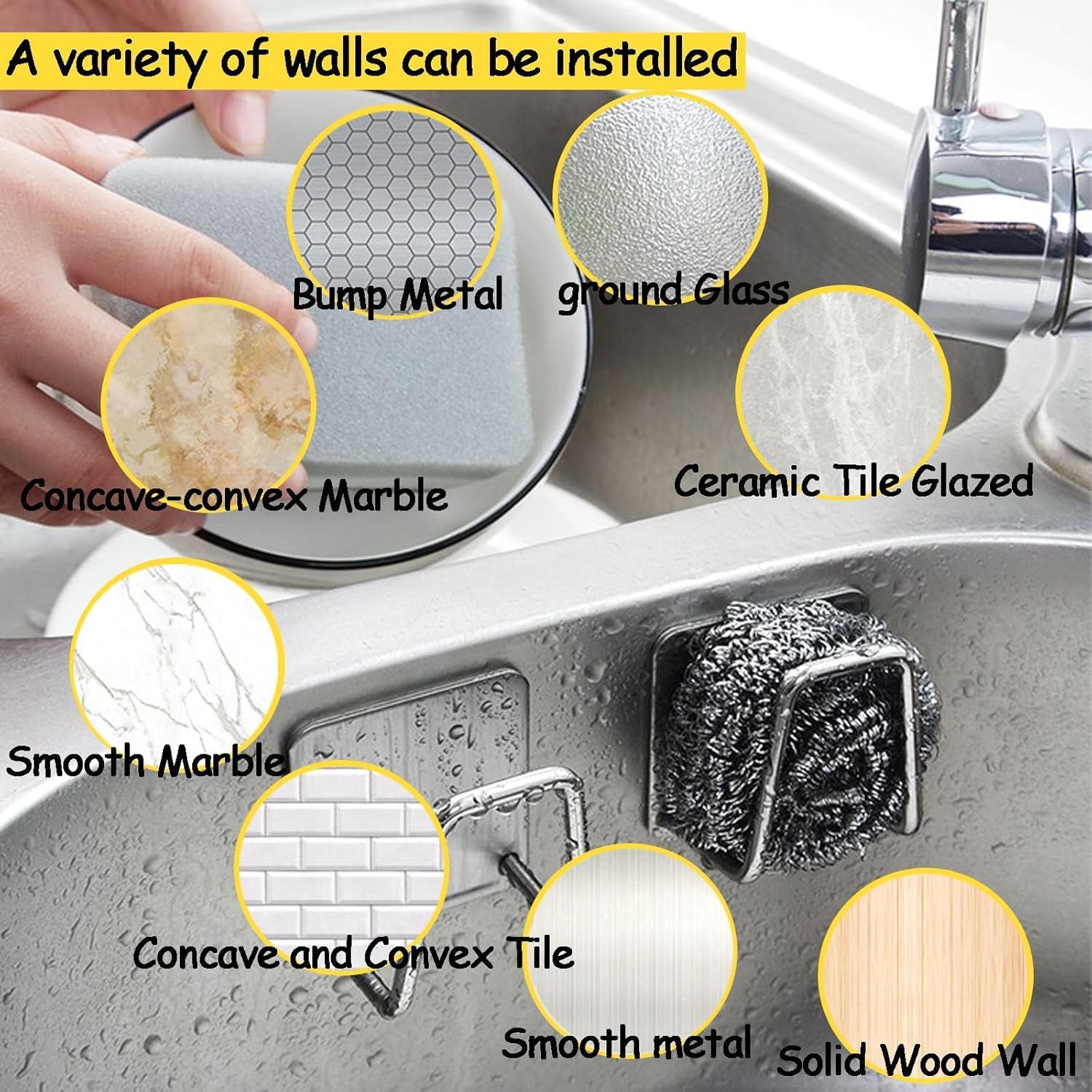 2 PCS Stainless Steel Sponge Stand, Sponge Drain Rack, Multi-purpose Design Sink Sponge Holder Space Saving Adhesive Kitchen Sink Stand and Sponge Drainer No Punching Can Placed Rag, Steel Wire Ball