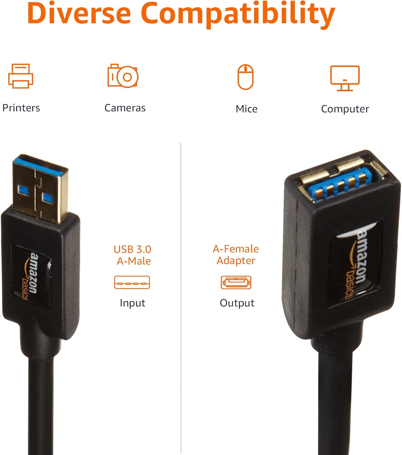 Amazon Basics USB 3.0 Extension Cable – A-Male to A-Female Adapter Cord – 6.5 Feet (2 meters)