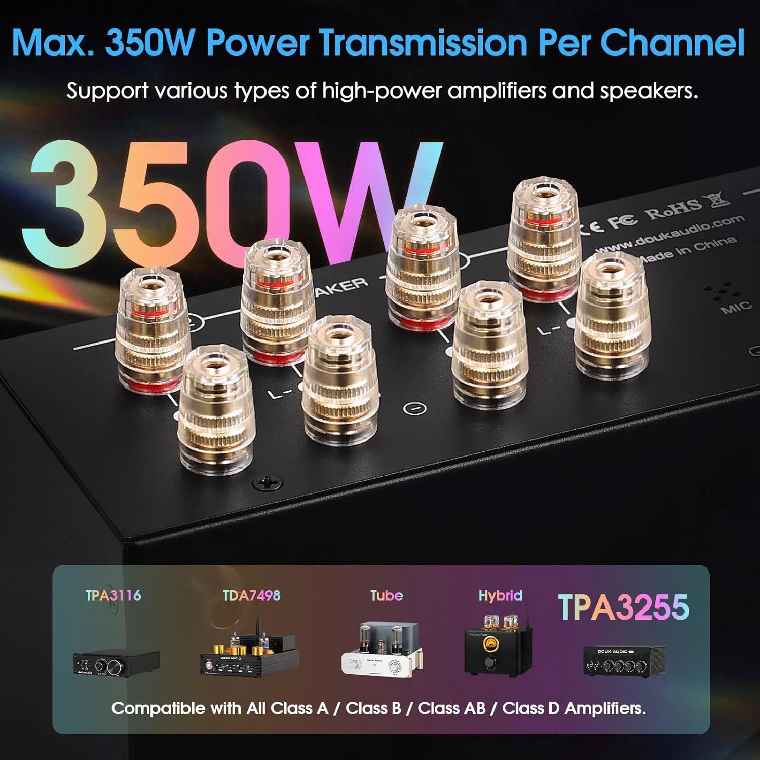 Power transmission max. 350W and Super Compatibility: With the increasing popularity of high-power amplifiers, the power requirements for switches have also increased. With a maximum transmission of 350W, the VU3Pro supports various types of high-power digital and tube amplifiers (BTL, Class A, Class B, Class AB, Class D, etc.), including 300W TPA3255 amplifiers and standing speakers.