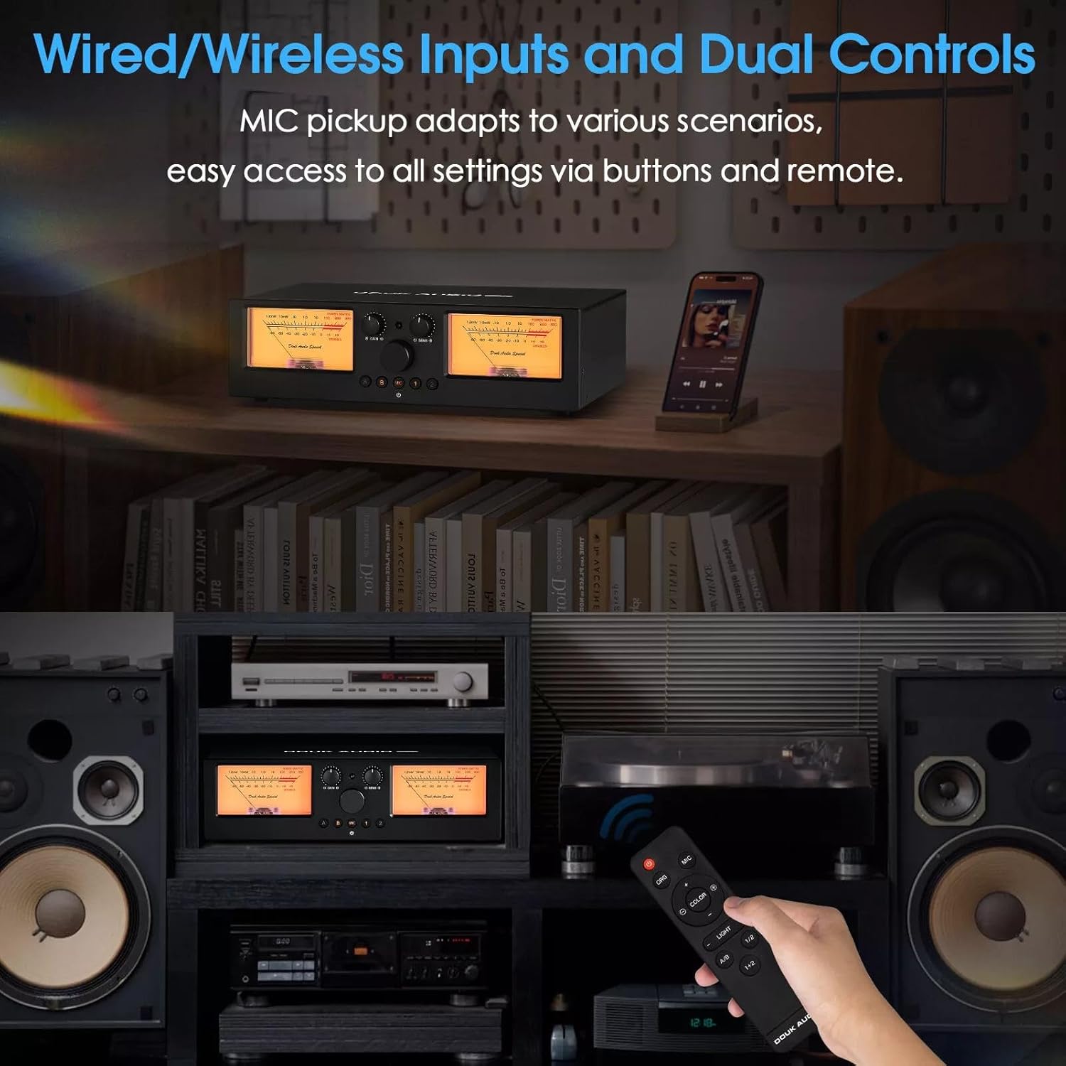 WIRELESS OR WIRELESS INPUTS & Ease of Use VU3Pro adds a mic jack, just place it near your audio system, clear indicators in two warm and vintage VU meters will strikingly show every beat of the music and dynamically activate your audio party. With a button and remote control, effortlessly change most settings at your fingertips and simplify the A/B comparison process. All settings will be saved after the device is turned off.