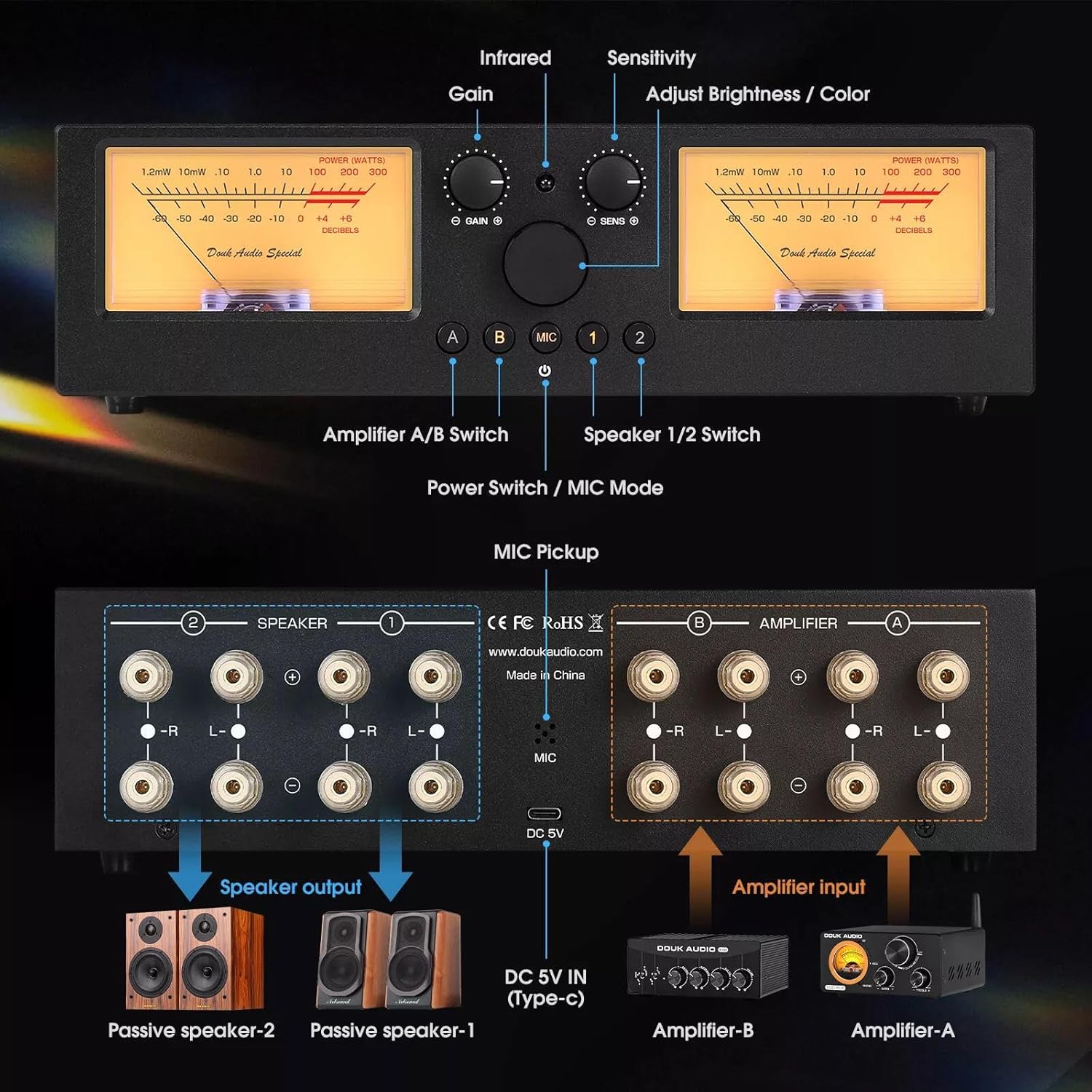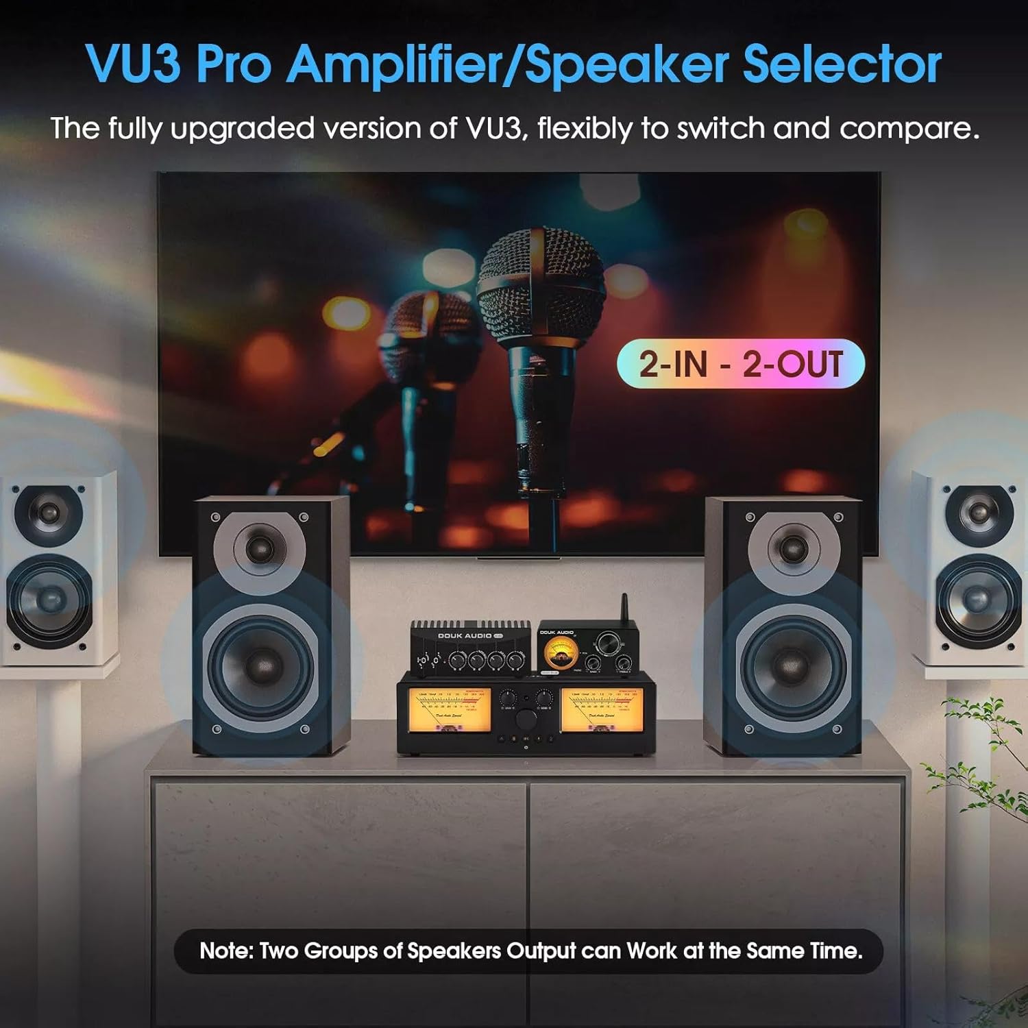 Douk Audio VU3 Pro Dual Analog VU Meter, 2-Way Amplifier Switch, Speaker Selector, 2-IN-2-OUT Amplifier Audio Switching Box with DB Panel Display