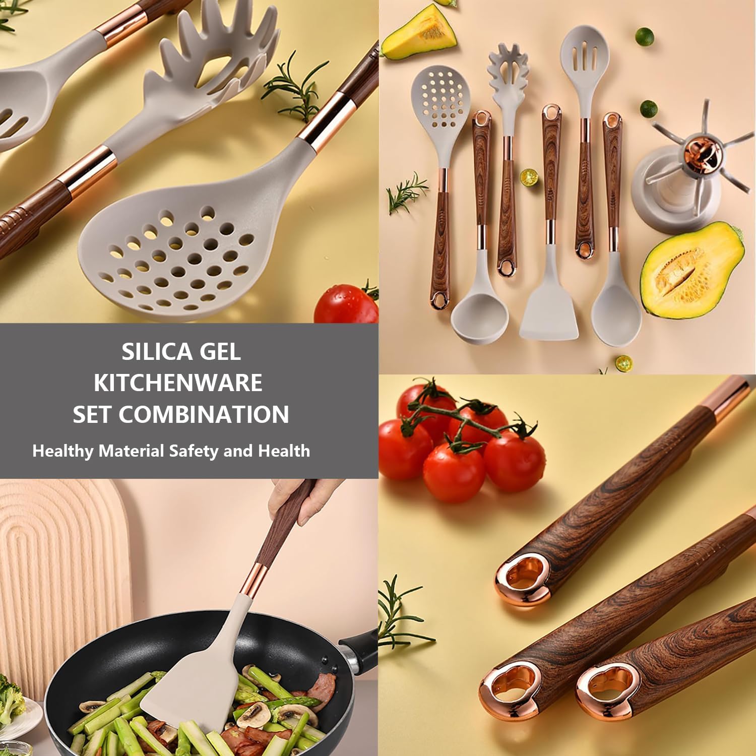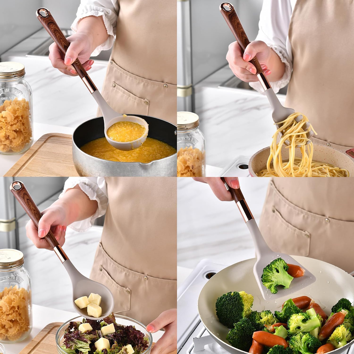 ✅HIGH TEMPERATURE WITHSTAND:The Silicone Cooking Utensils can withstand high temperatures up to 446°F/230°C. All-around silicone added to the softness, no longer worry food will stick your cookware. Silicone head protect your pans, keep the cookware surface not scratched or dented. Extend the life of all your kitchen pans. They are scratch resistant, unlike plastic and rubber utensils that will easily melt or metal kitchen utensils harm your nonstick pots