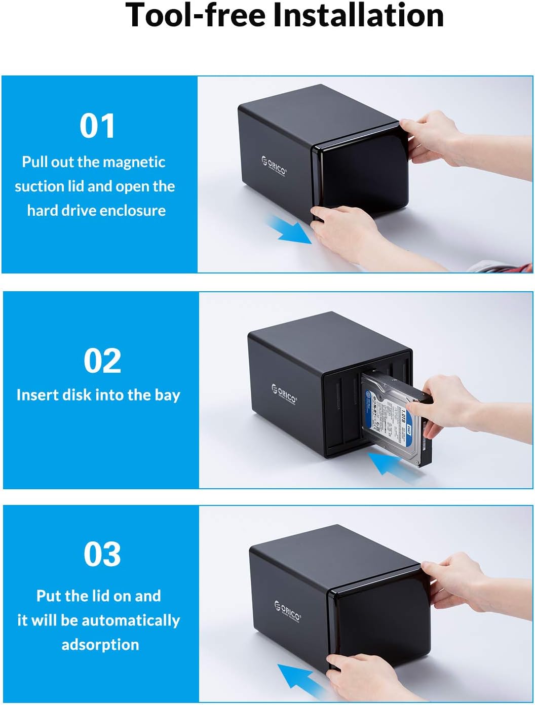 TOOL-FREE INSTALLATION — The construction of the 5-bay drive enclosure is magnetic design with 8 magnetic chips on the cover, you can just spend 3 seconds to complete the drive installation and prolong the service life of the cover, easy your working way and saving time