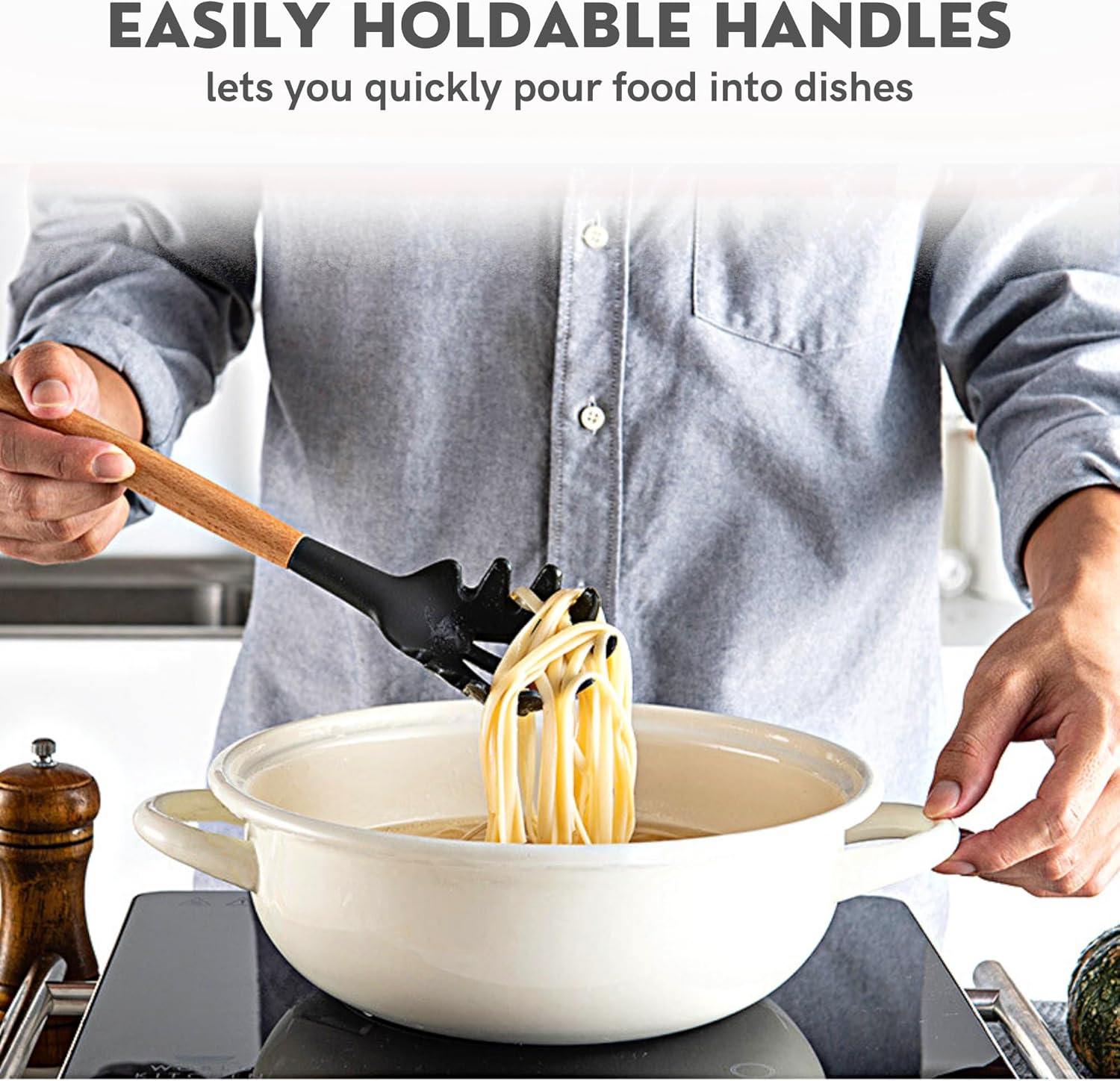 🧼 Easy Clean, No Food Traps: Experience hassle-free maintenance like never before. Each utensil is seamlessly crafted to eliminate gaps where food can linger. Stainless steel additions maintain their shape and flexibility, promising resilience and enduring performance. Optimal one-piece molding simplifies cleaning, while the wooden handles encourage hand washing. Dishwasher-safe options, including the small spatula, food tongs, and utensil holder, streamline your cleanup routine.