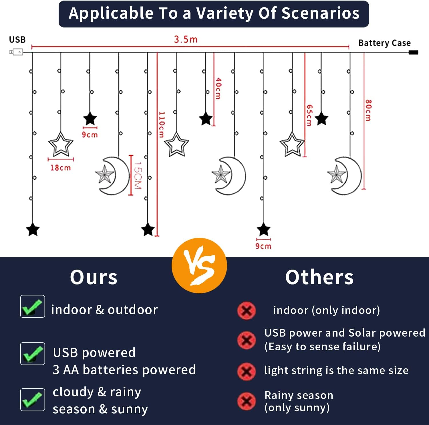 USB and Battery Power Supply: The moon star Ramadan lights can be connected to a power supply via USB or 3AA batteries (batteries not included). The USB wire of star lights is 2M long, allowing you to connect up to cover a large area.